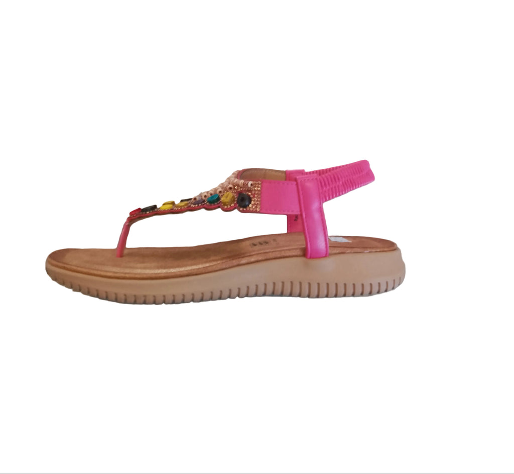 In Fuchsia Pink with multicolored beads and a cushioned foot bed, this sandal has a toe post and elasticated(pull-on) back strap.