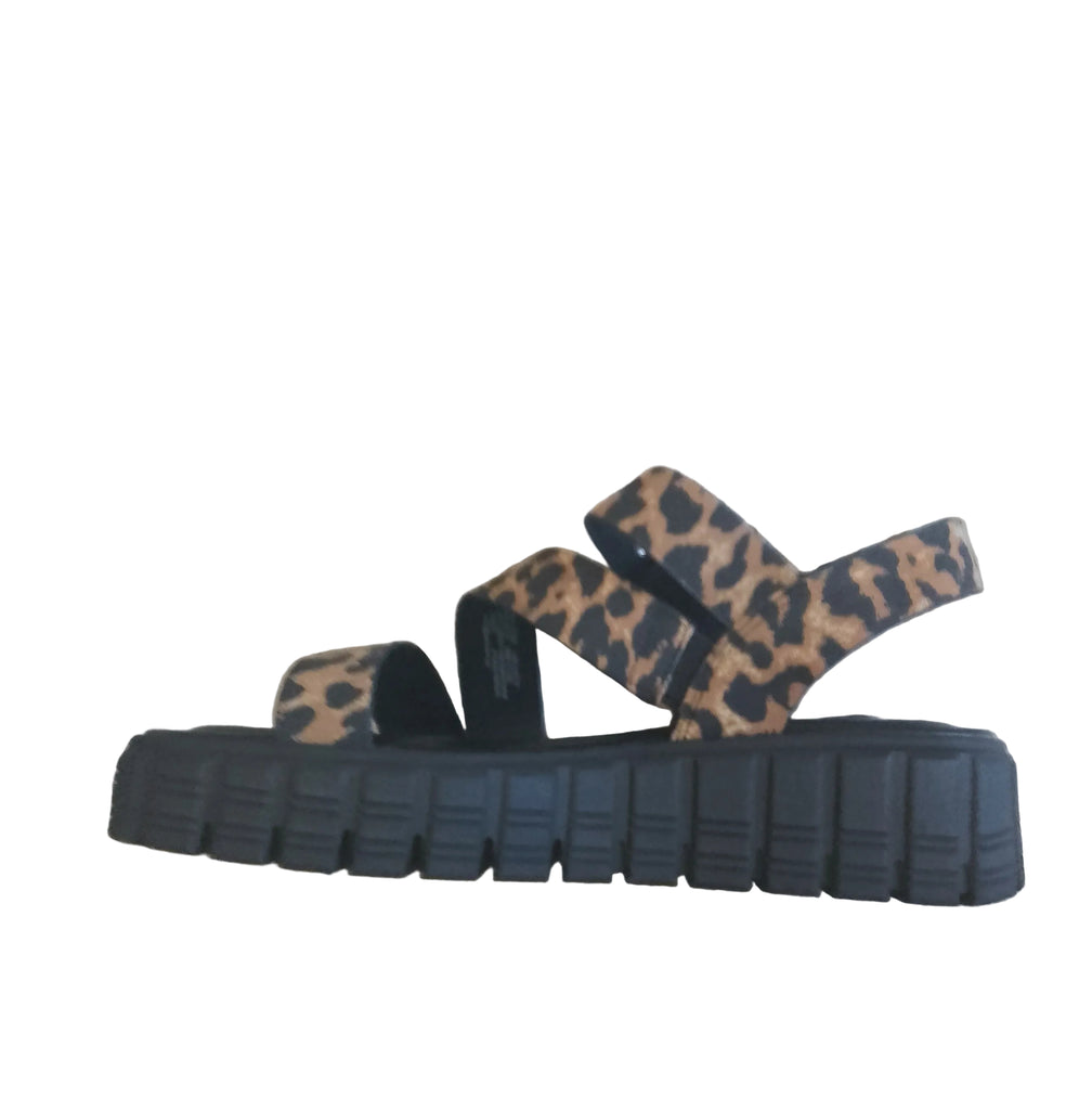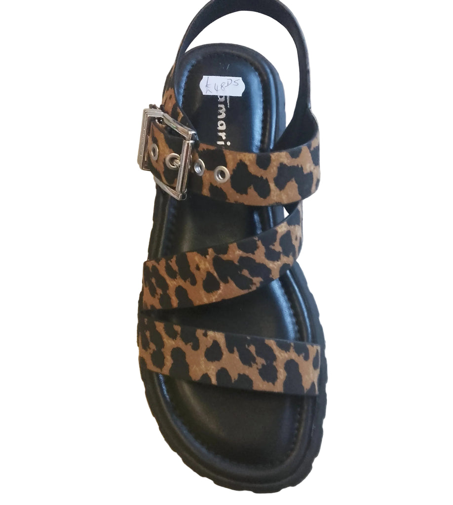 A chunky sandal from Tamaris with a black platform sole and animal print adjustable straps.