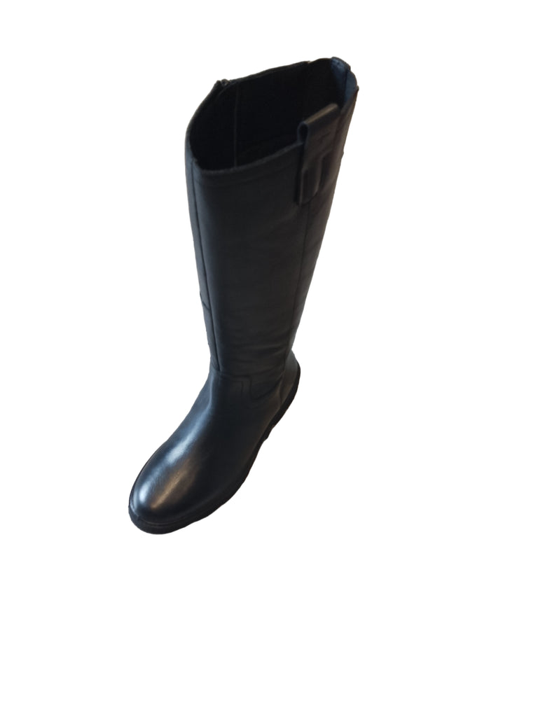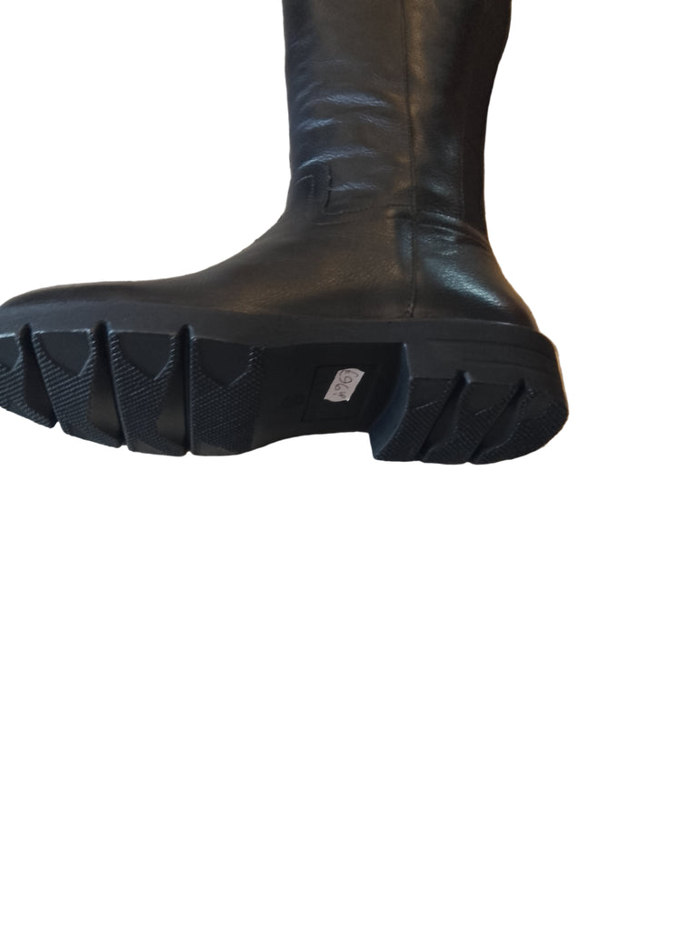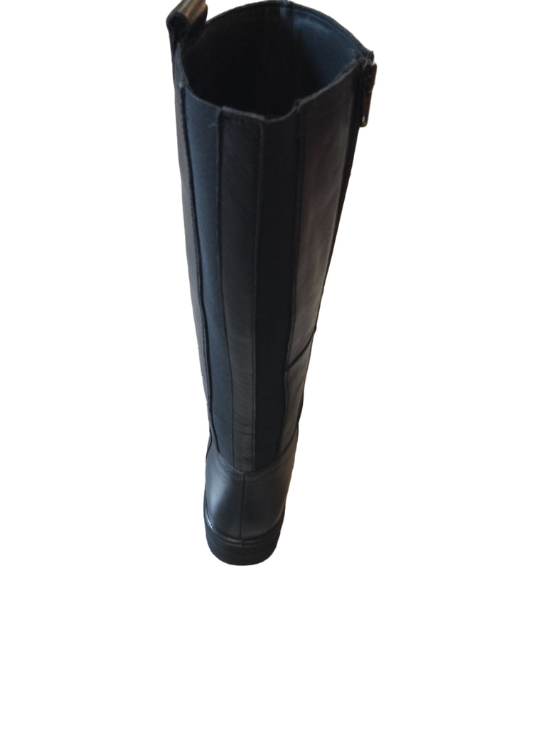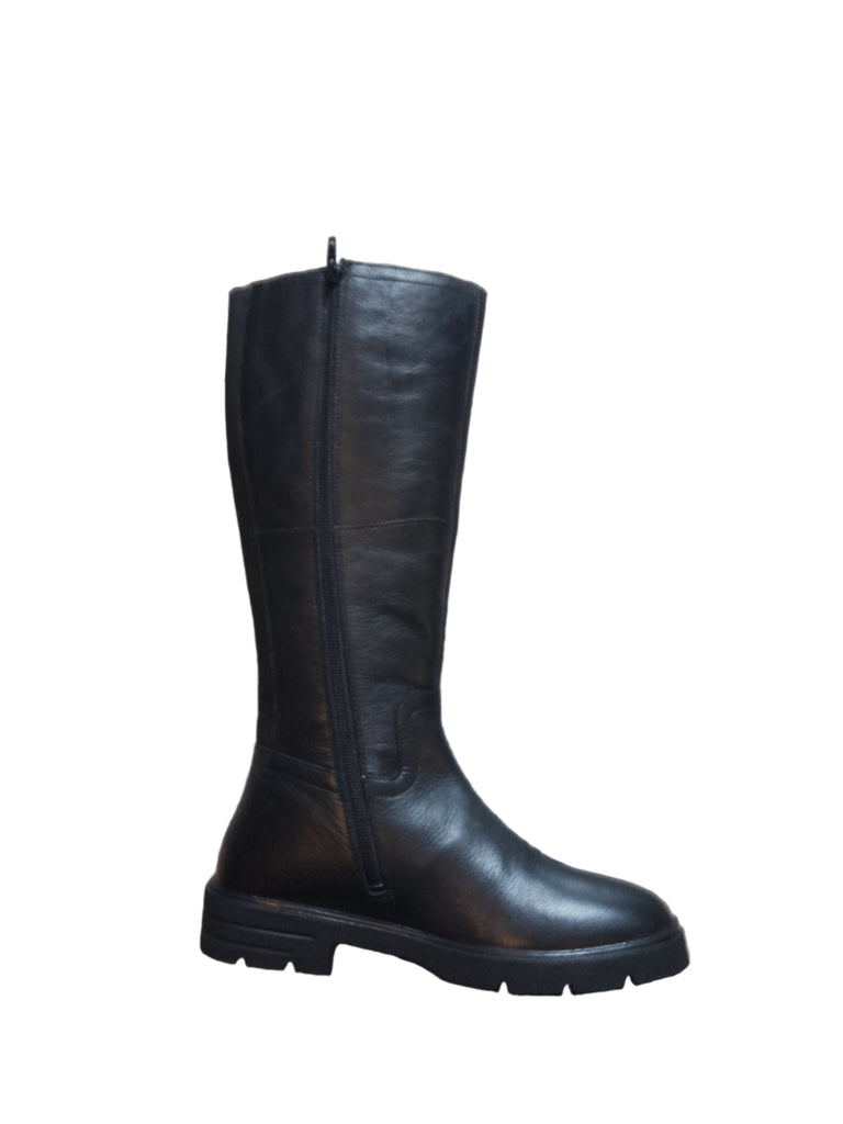 A Knee Length Boot in soft black leather with a flat sole and zip fastening from Tamaris.The boot has a cushioned foot bed and non slip sole and is at a fabulous price for genuine leather.