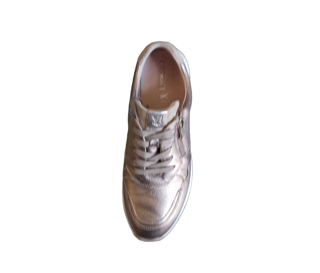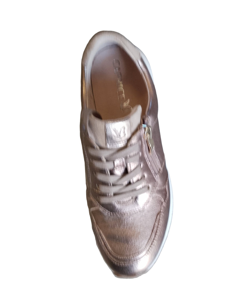 A lovely comfortable and stylish trainer from Caprice in metallic taupe leather with animal print trim to the heel.The trainer fastens with laces and a zip and has a removable cushioned foot bed and low wedge non slip sole.