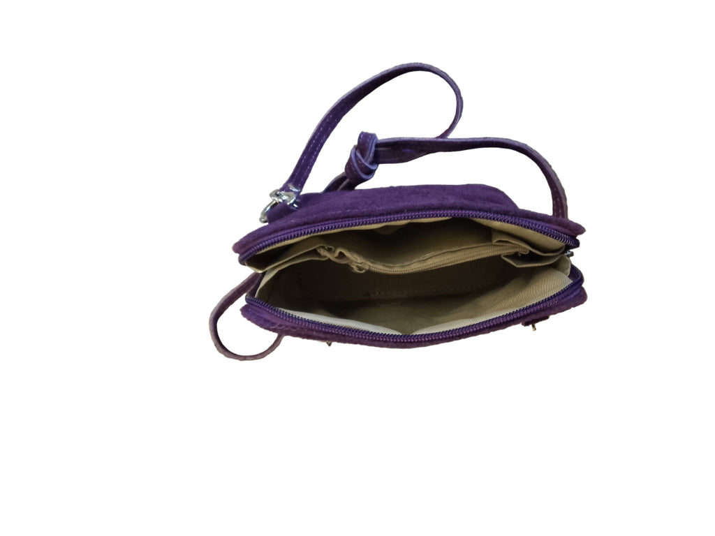 In soft purple suede leather with a detachable long strap and internal and external pockets,this bag fastens with a zip top and has waterproof lining the dimensions of 7 x 7 inches make it an ideal bag for nights out as well as day wear .Also available in fuchsia and black