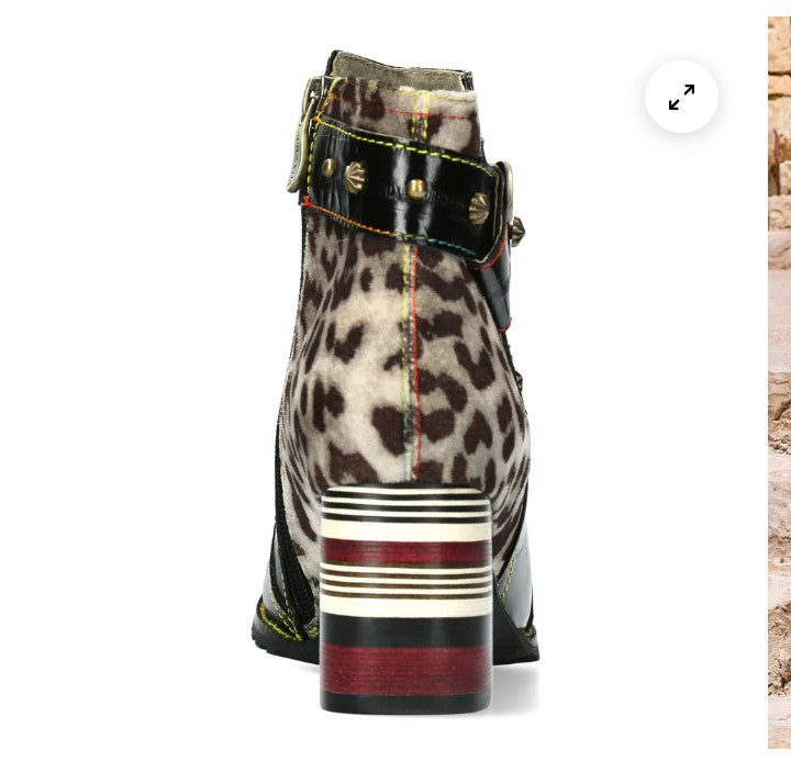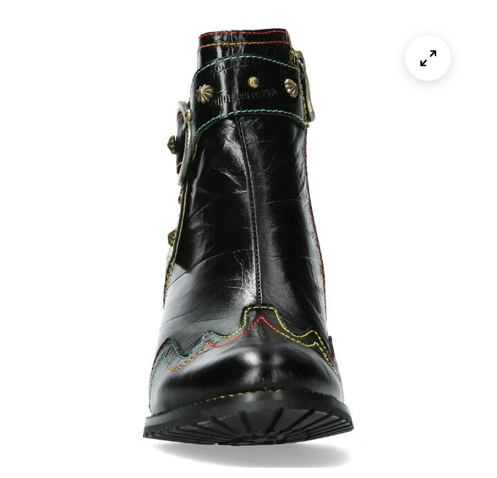 A black leather ankle boot with multi colour stitching, a zip fastening and cushioned foot bed from Laura Vita.The boot has a fancy block heel and animal print detail to the back and heel.