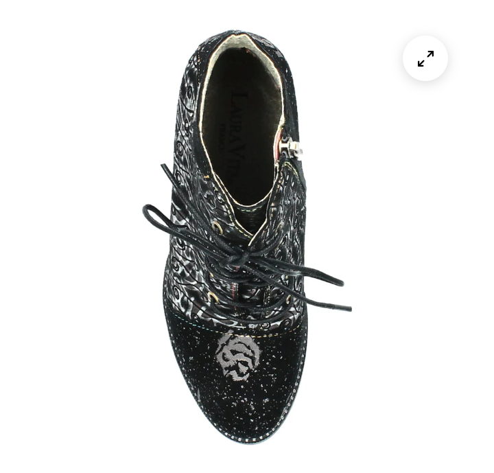 A Heeled black leather ankle boot with gold and bronze embellishment from Laura Vita.The boot fastens with laces and a zip,has a cushioned foot bed and an 8cm heel.