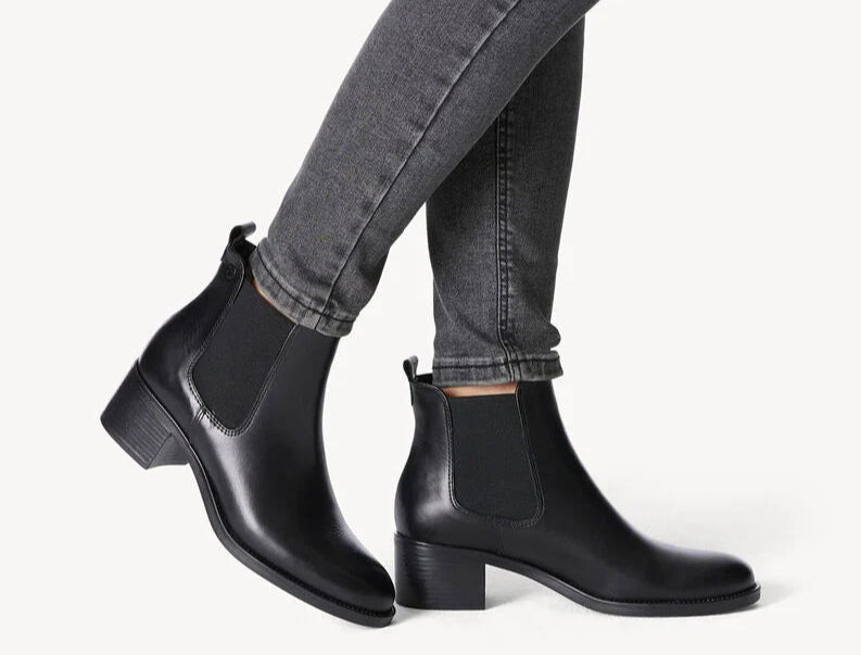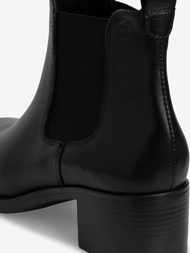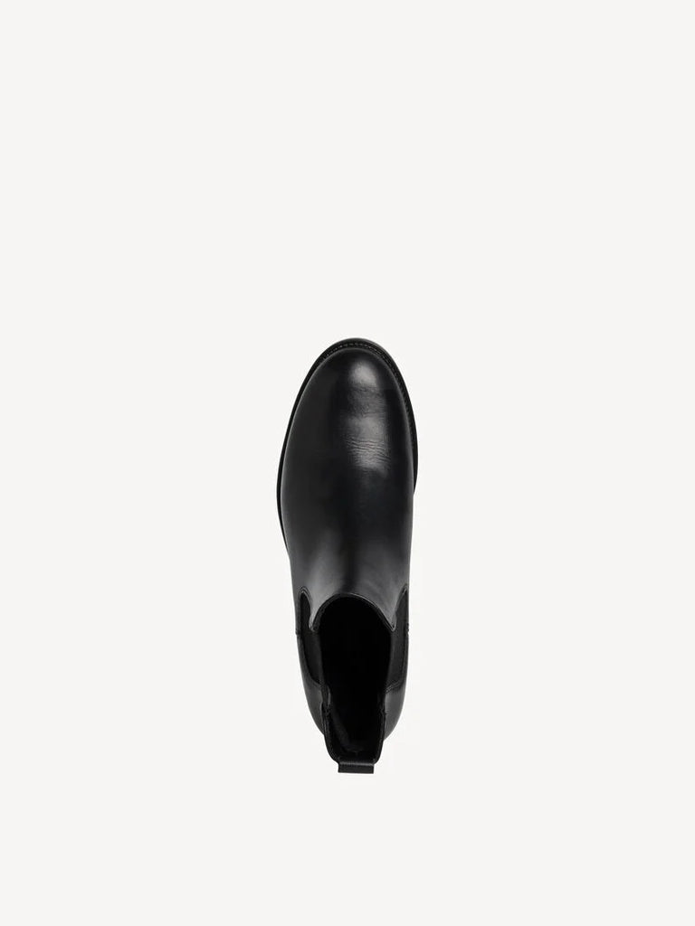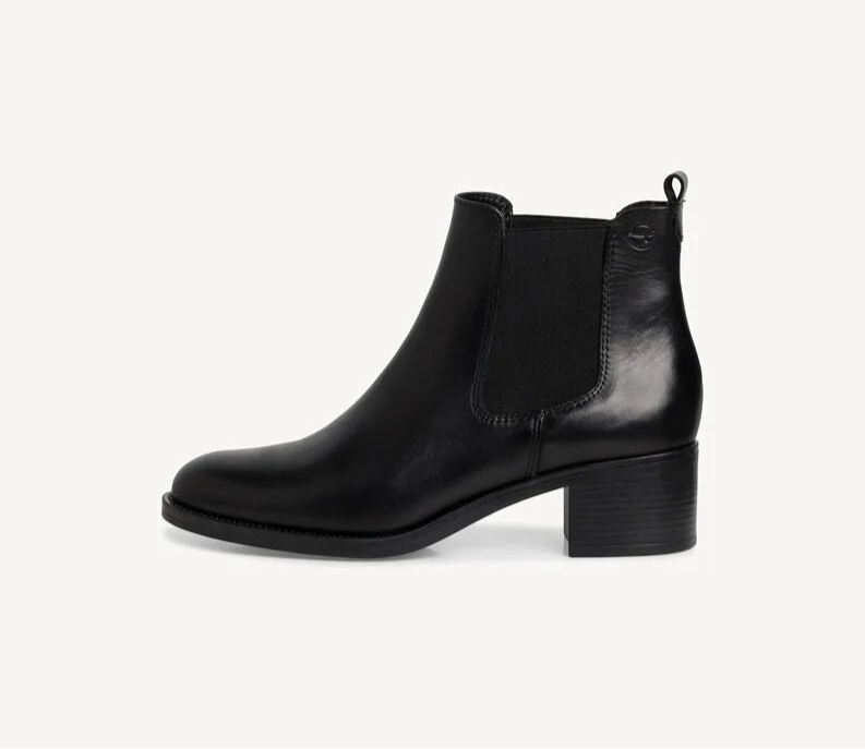 A pull on Chelsea style ankle boot from Tamaris in black leather. The boot has a cushioned foot bed, non slip sole and a 4.5cm block heel.