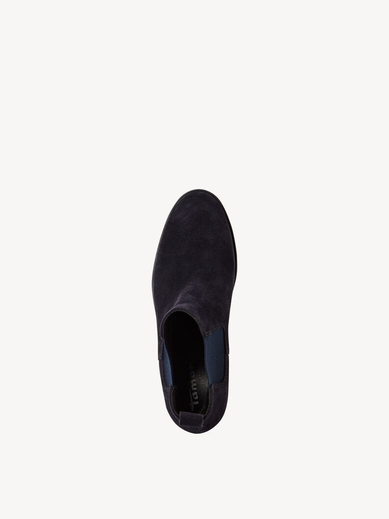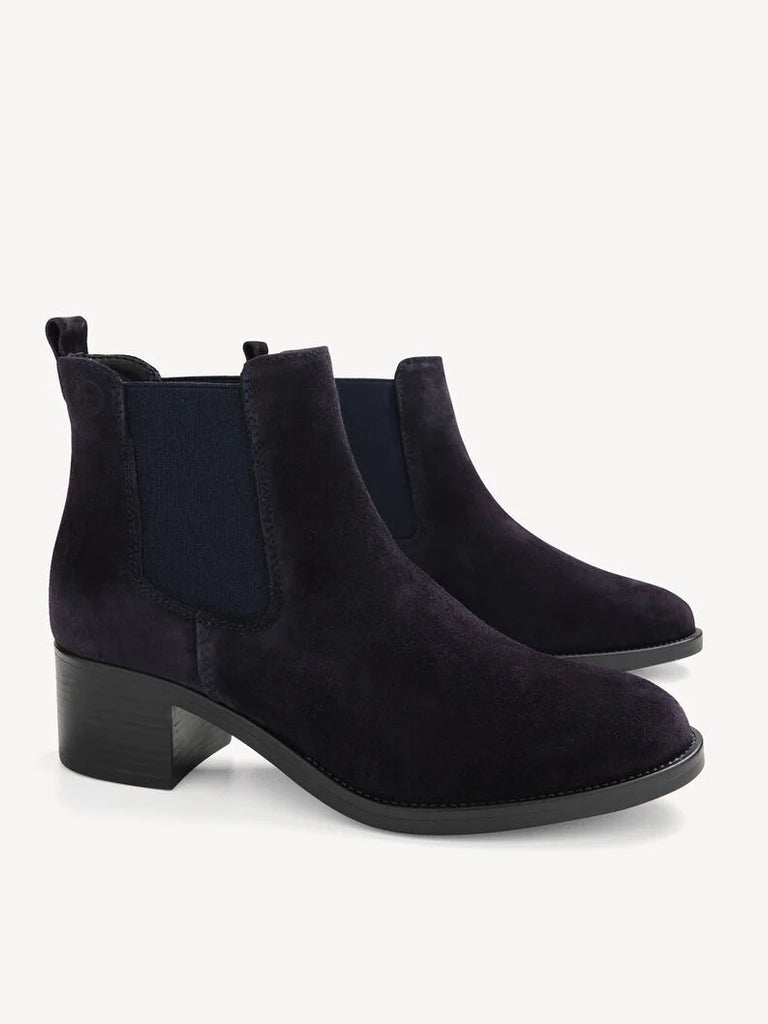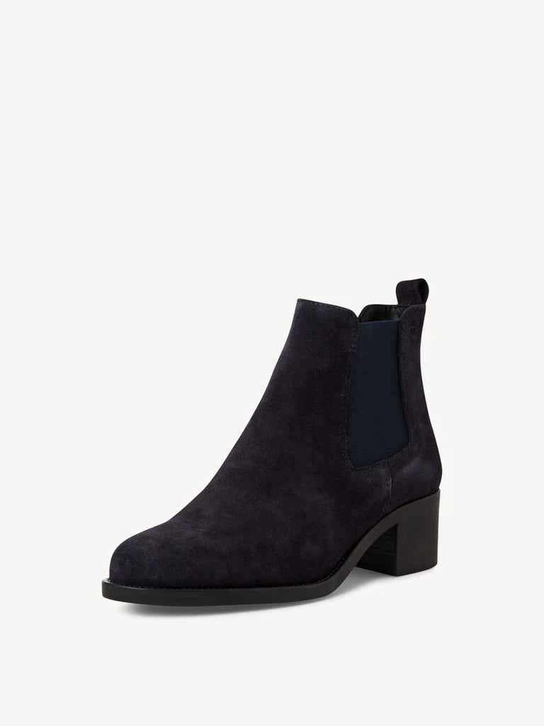 A pull on Chelsea style ankle boot from Tamaris in navy suede leather. The boot has a cushioned foot bed, non slip sole and a 4.5cm block heel.